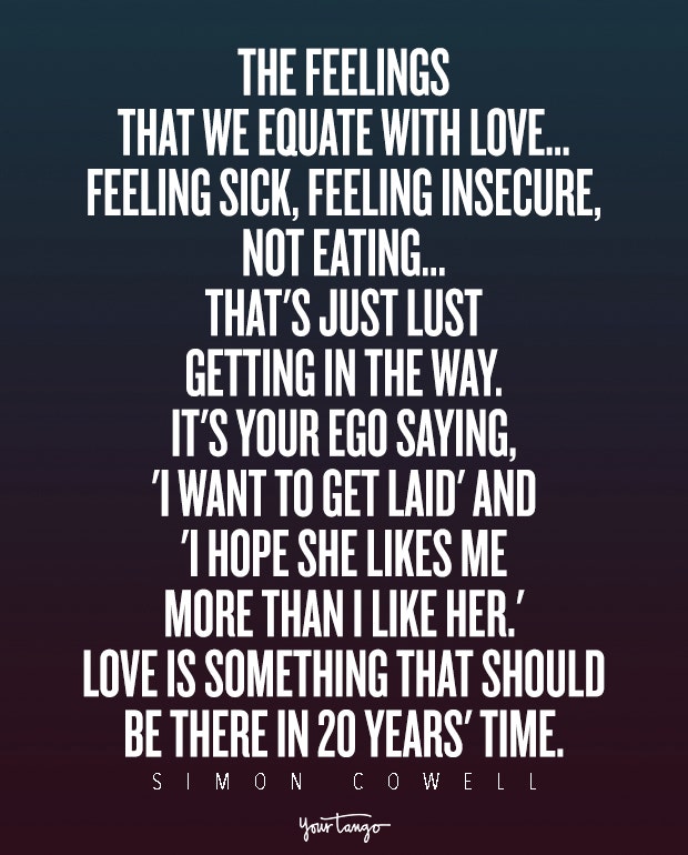 "The feelings that we equate with love—feeling sick, feeling insecure, not eating—that's just lust getting in the way. It's your ego saying, 'I want to get laid' and 'I hope she likes me more than I like her.' Love is something that should be there in 20 years' time." — Simon Cowell