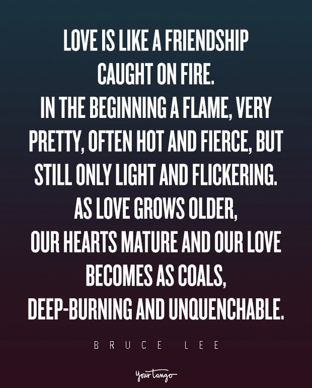 "Love is like a friendship caught on fire. In the beginning a flame, very pretty, often hot and fierce, but still only light and flickering. As love grows older, our hearts mature and our love becomes as coals, deep-burning and unquenchable." — Bruce Lee