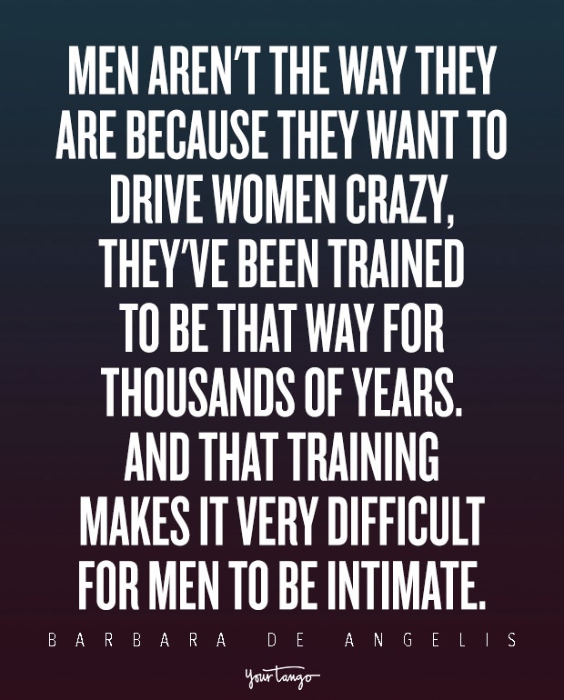 "Men aren't the way they are because they want to drive women crazy, they've been trained to be that way for thousands of years. And that training makes it very difficult for men to be intimate." — Barbara De Angelis, Relationship Counselor