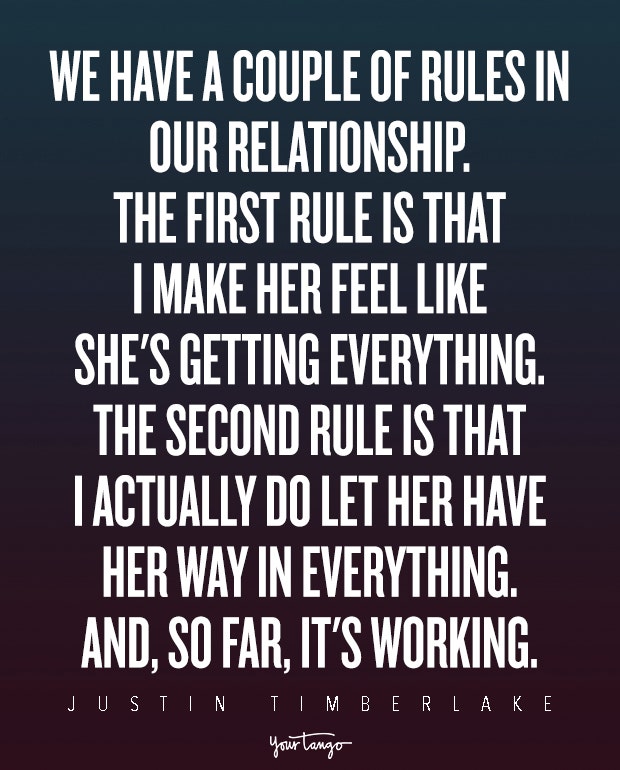 "We have a couple of rules in our relationship. The first rule is that I make her feel like she's getting everything. The second rule is that I actually do let her have her way in everything. And, so far, it's working." —Justin Timberlake