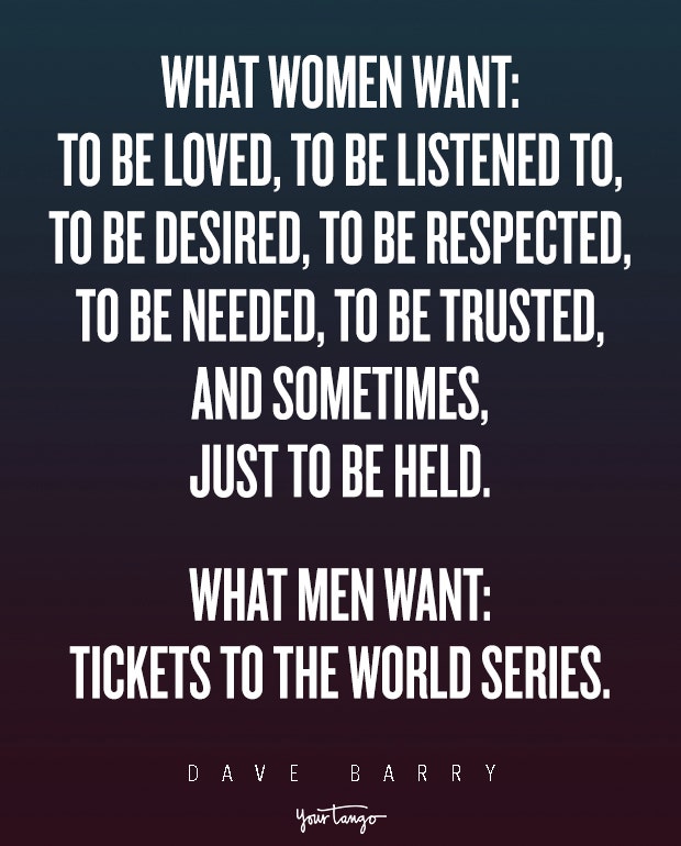 "What women want: To be loved, to be listened to, to be desired, to be respected, to be needed, to be trusted, and sometimes, just to be held. What men want: Tickets to the World Series." — Dave Barry