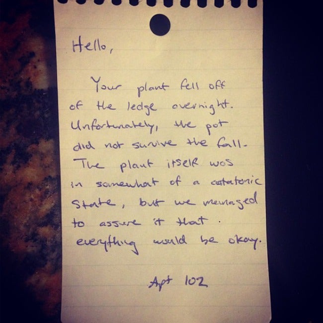 If you thought those brutally honest notes from kids were bad, these passive-aggressive neighbors take it another level. Head over to Twenty Two Words for even more hilarity: