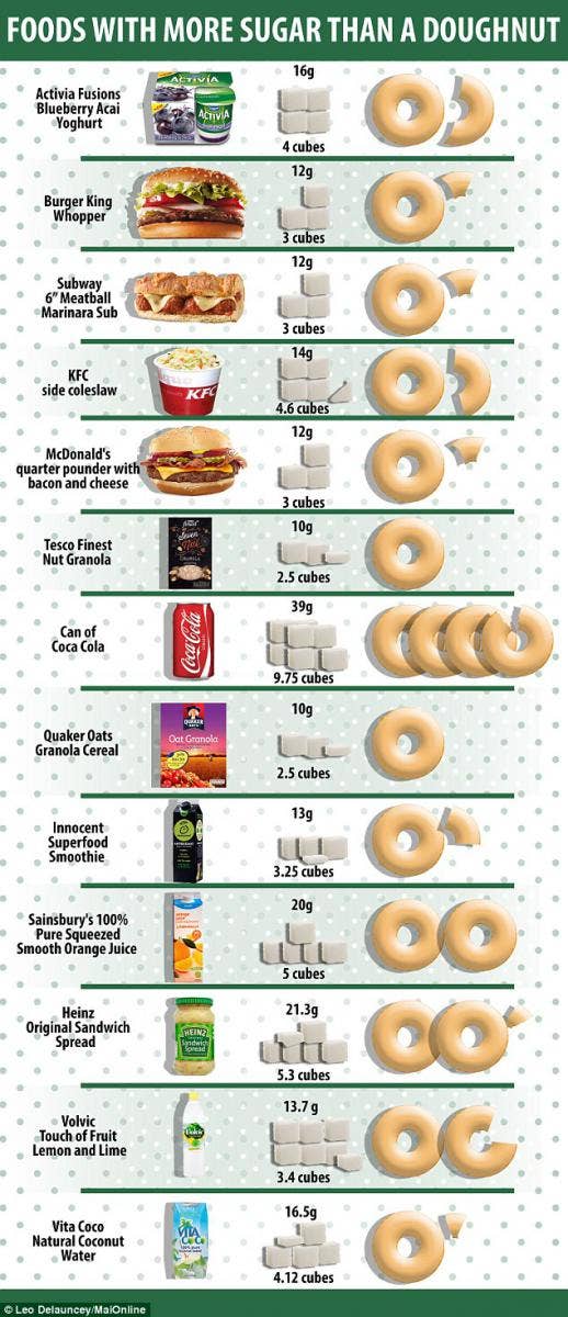 Is your daily diet comprised of at least one of these so-called "healthy" foods? FEMAIL compiled this list to show you exactly how much sugar your yogurt or granola bar is equivalent to, in terms of donuts.