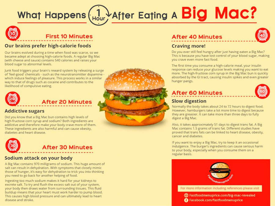 After 20 minutes, we want more sugar and salt: By eating the McDonald's flagship burger, our blood sugar levels spike, which in turn can increase insulin resistance (a precursor to diabetes). The highly addictive sugar and salt can make you crave more of these substances and cause you to overeat.