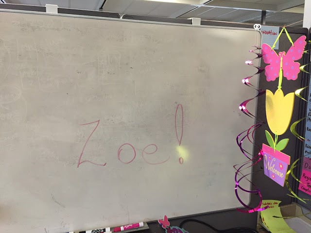 She got in and found that a couple of them had decorated her cubicle to surprise her: