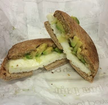 I felt way better about scoring at Au Bon Pain because I had an actual coupon promising me a free sandwich, which was sent to me a few days after joining their eClub. I went with egg, cheddar and avocado on a bagel, and approached the cashier with my license and the coupon.