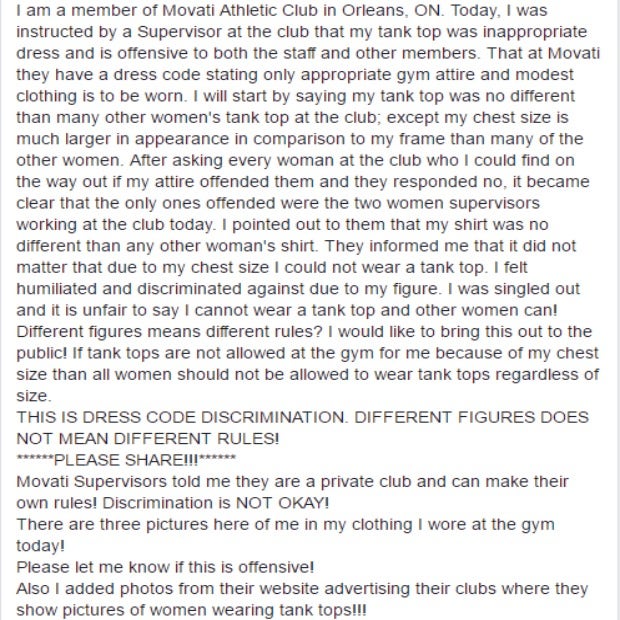 Vecchio and her husband were working out together at their gym in 2016 — Movati Athletic Club in Orleans, Ontario — when a gym supervisor approached to inform her that her tank top was inappropriate gym attire and that her appearance was making other gym patrons uncomfortable. Her "chest," the Movati employee explained, was "too big" for her tank top, and members had complained.