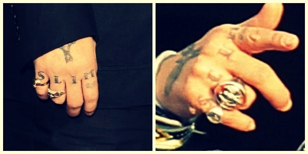 Depp had originally had the word “SLIM” tattooed on his fingers as a tribute to Heard (“Slim” was his nickname for her). However, after their well-publicized split, Depp, apparently, decided to turn his fingers into the equivalent of a ninth-grade burn book and had the word “SLIM” changed to “SCUM.”