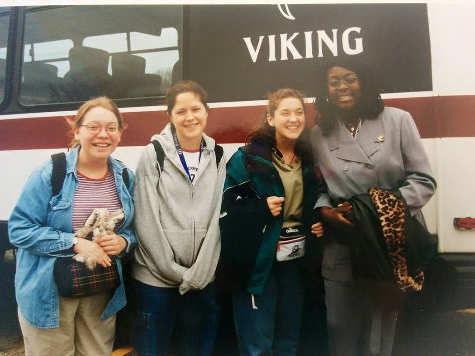 (me on the far left with a stuffed bunny, fanny pack, pleated shorts, and full D cup)