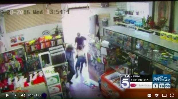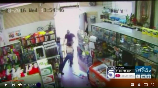 Still, he goes about his business, allowing the kidnapper to leave the store dragging this poor woman out without doing a thing.