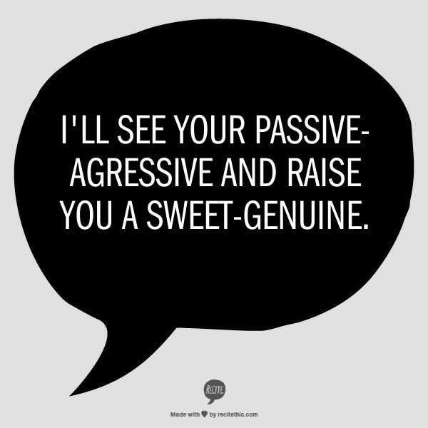 "I'll see your passive-aggressive and raise you a sweet-genuine."