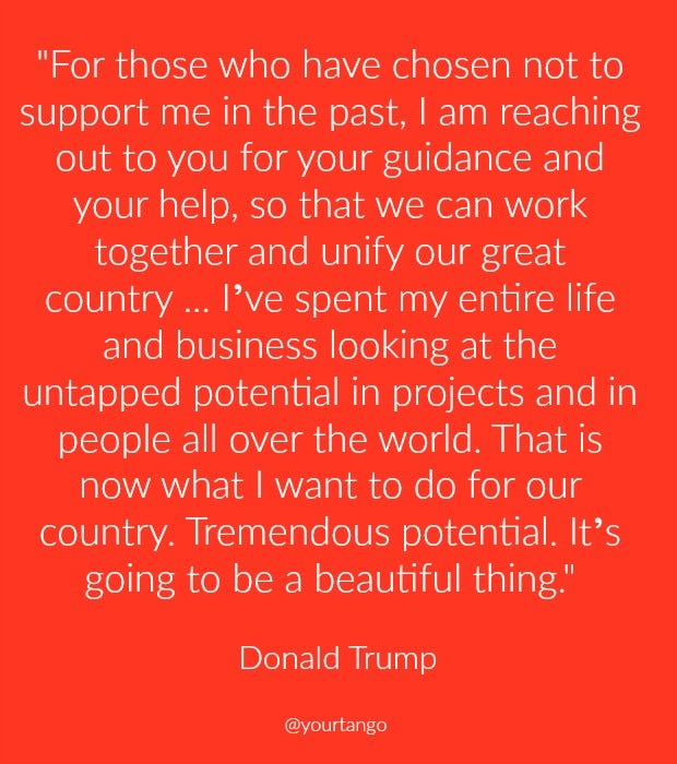 For those who have chosen not to support me in the past, I am reaching out to you for your guidance and your help, so that we can work together and unify our great country ... I’ve spent my entire life and business looking at the untapped potential in projects and in people all over the world. That is now what I want to do for our country. Tremendous potential. It’s going to be a beautiful thing."