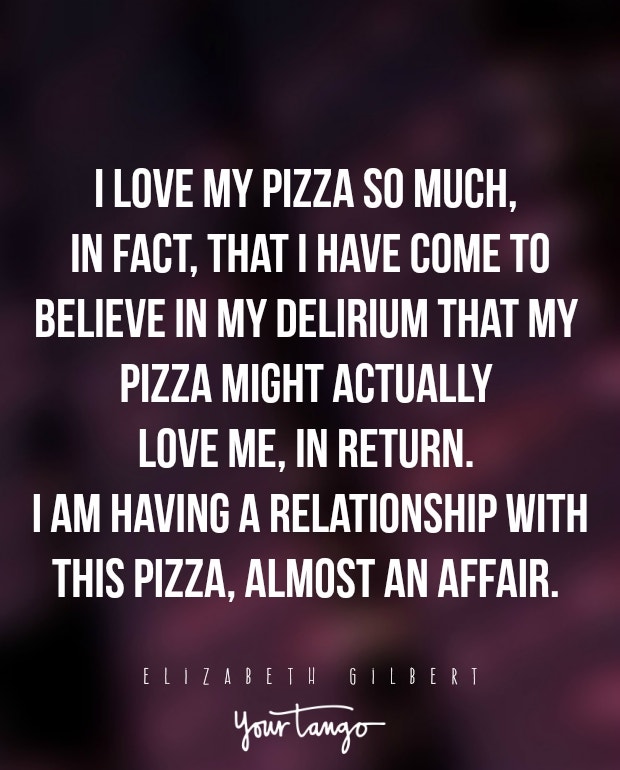 "I love my pizza so much, in fact, that I have come to believe in my delirium that my pizza might actually love me, in return. I am having a relationship with this pizza, almost an affair."— Elizabeth Gilbert