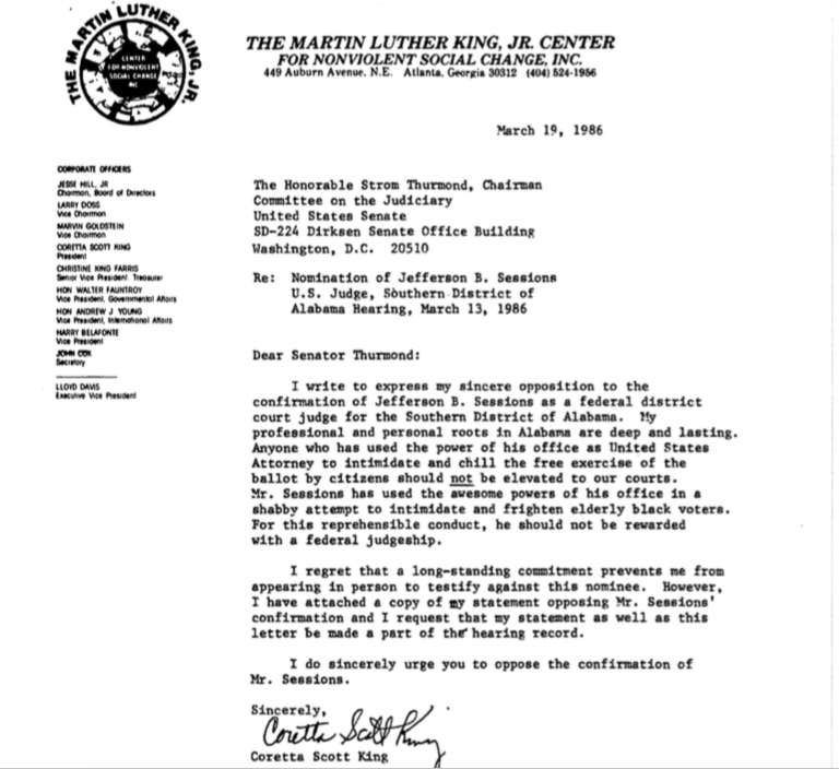 In closing, I'd like to take this opportunity and share the entire body of Coretta Scott King's letter. Because it's important. Because it shines a light on Jeff Sessions' true nature and underlines why a man like him should be nowhere near an office like that of U.S. attorney general: