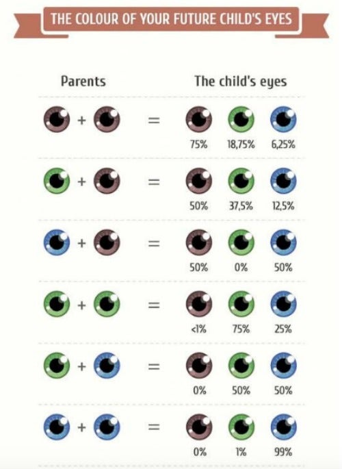 As mentioned above, DNA works in patterns. Follow the eye color chart below and find out the likelihood of your child getting your eye color or your partner's. Of course, as mentioned before, dark eyes tend to win.