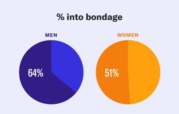 "When we asked about 'Would you rather ... 64% of men and 51% of women said they either wanted to 'be tied up during sex,' 'do the tying,' or 'sometimes be tied up, sometimes do the tying.' The rest said 'avoid bondage altogether' or skipped the question."
