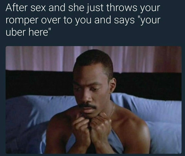 "After sex and she just throws your romper over to you and says, 'your uber here.'"