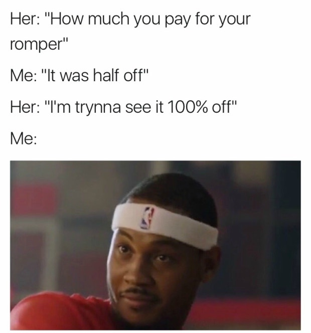 "Her: How much you pay for your romper? Me: It was half off. Her: I'm tryna see it 100% off. Me: ."