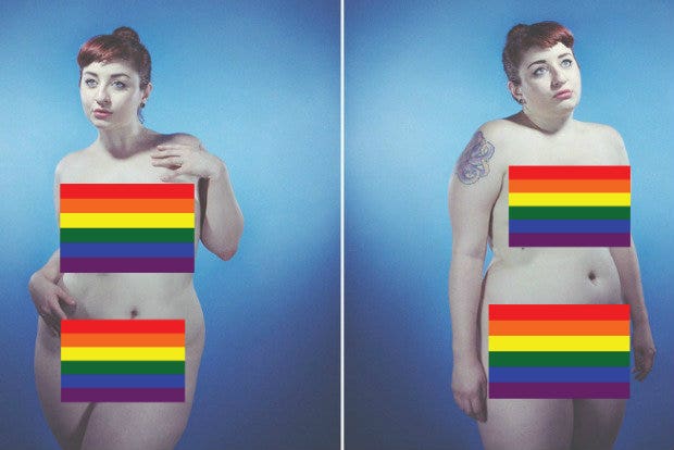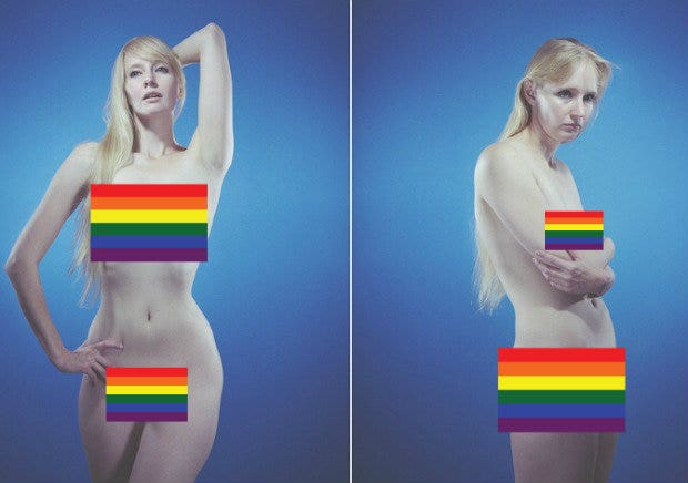 In this series of paired photos, the subject is a naked model in a flattering or confident pose while next to a contrasting picture of the same woman is in an uncomfortable or awkward pose.