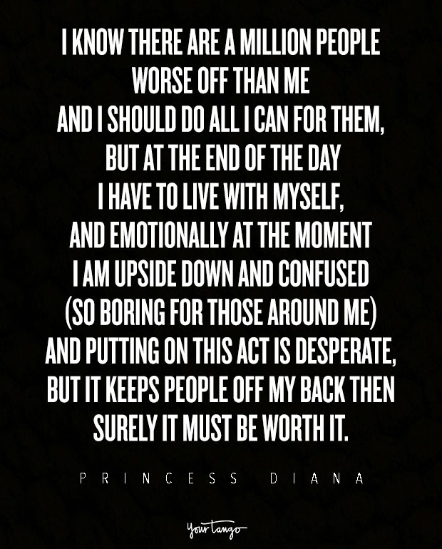 “I know there are a million people worse off than me and I should do all I can for them but at the end of the day I have to live with myself and emotionally at the moment I am upside down and confused (so boring for those around me) and putting on this act is desperate but it keeps people off my back then surely it must be worth it.”
