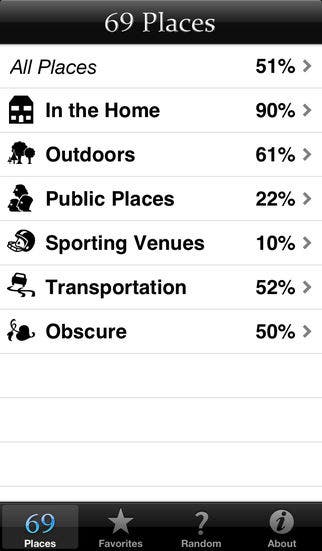 You can keep track of where and how many times you've made love in certain areas and watch as your percentage of all 99 locations rise. Can you reach all 99? Or at least 69 maybe? The app has several intriguing categories such as Transportation, Sporting Venues, and if you're feeling a little less daring, In the Home. Within those categories are even more subcategories, such as Dressing Room, Elevator, Copy Machine, and even Mansion.
