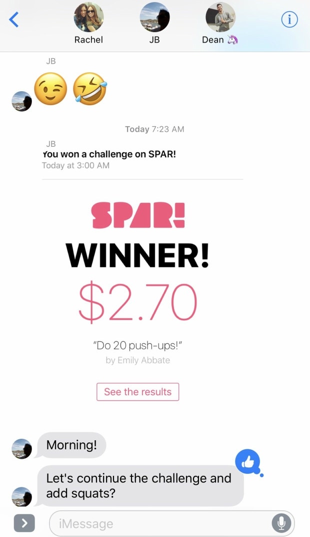Watching my friends execute their reps (Spar makes you record a 10-second video every day when you check-in to show the challenge participants you're not fibbing), I felt motivated to do mine. The trash talking . . . well, that motivated me a bit, too.