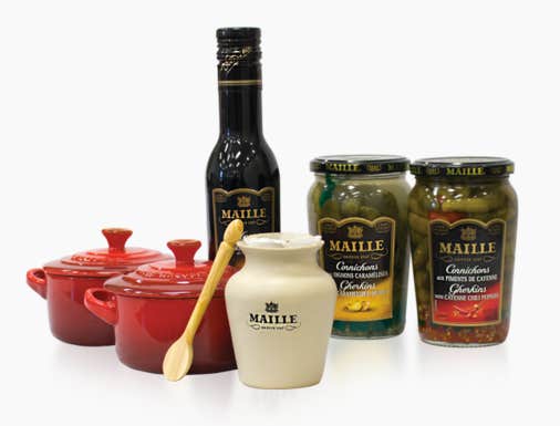 Le Creuset and Maille teamed up to offer a limited edition pairing to offer everything you’ll need for a delicious dinner for two in a sleek gift set which includes: two Le Creuset round mini cocottes, Maille Dijon Original mustard in white wine in a stoneware jar, Maille engraved mustard tasting spoon, cornichons with cayenne chili peppers, cornichons with caramelized onions, and balsamic vinegar glaze.