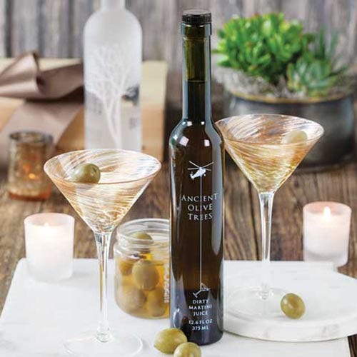 Garnished with shimmery copper-tone swirls, these 8-ounce martini glasses are ready for your favorite gin or vodka served with Mediterranean olives and premium olive brine. A set of two glasses, bottle of brine and jar of olives all arrive gift wrapped together in a hand crafted wood crate with ribbon.