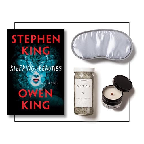 Horror writer Stephen King and his son Owen have produced their first co-written novel, a chilling contemporary fairytale about a mysterious sleeping sickness spreading among the women of a small town, transforming them into terrifying furies if they're awakened. This gift set pairs the novel with a set of gifts that encourage a far gentler napping experience for all: a silky, charcoal-infused eye mask, small rose-scented soy wax candle and a jar of "Detox" bath salts with purifying eucalyptus and Cambrian blue clay.