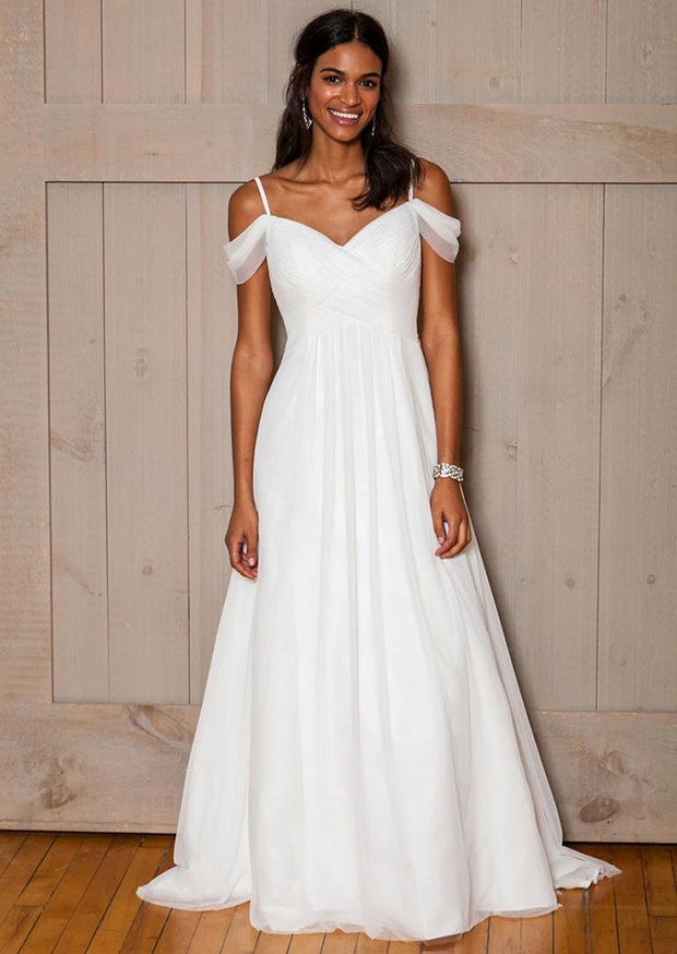A-line one-shoulder chiffon wedding gown. This dress has a lot of zest. If you want a different goddess like look this is perfect!