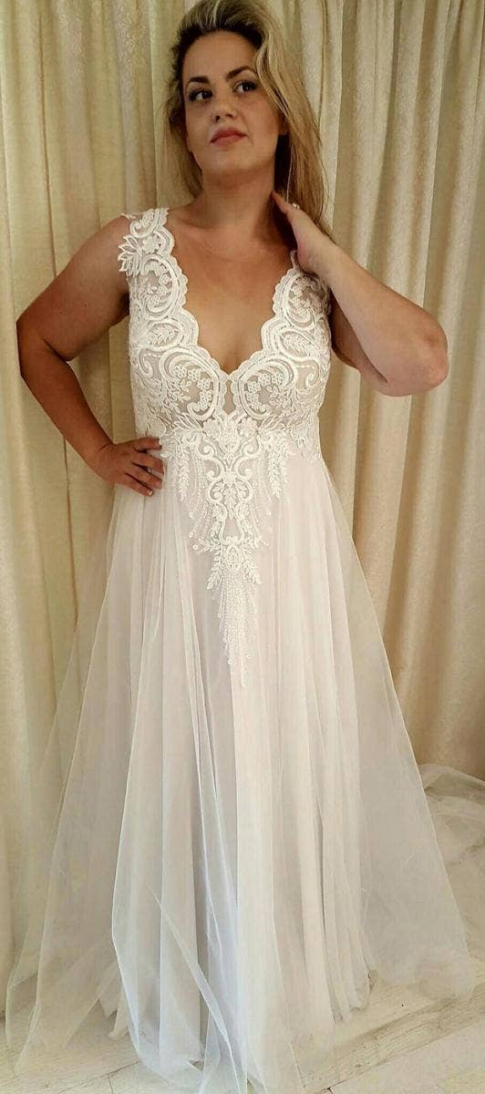 A-line princess cut lace floor length dress. Beautiful and simple from the curvy collection. With the light fabric and lace accents it is perfect for a summertime or springtime wedding!