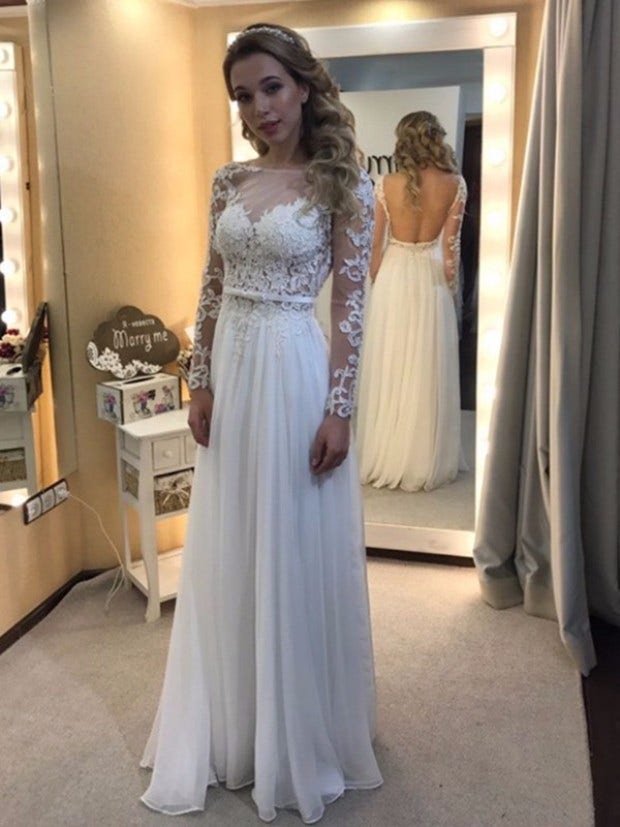 A-Line princess bateau/ floor length long sleeve dress. This dress will make you feel like a fairy princess from the moment you put it on. You'll never want to take it off because it's so magical!