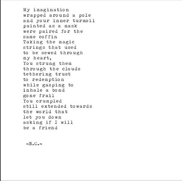 This is one of the more traditional poems because it has a nice length and its concept is presented in an abstract way. It also delivers in emotion which sometimes gets lost when trying to be poetically abstract. N.C. achieves this by balancing abstract ideas with concrete details.
