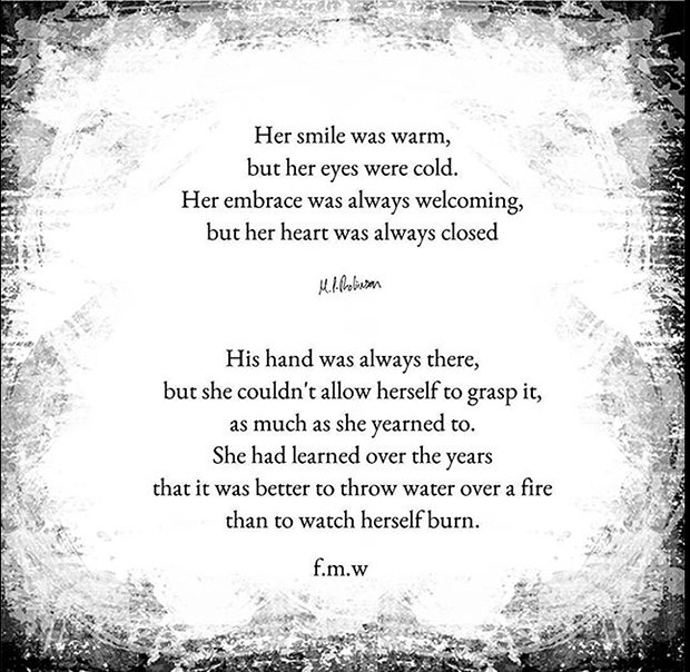 Contrary to the previous poem, this one is more about the aftermath of a powerful relationship. Fire and water are common symbols for the power a loved one has on another person. This poem is unique in that it uses both as opposed to one or the other element. It also shows how a person has the power to become like both elements. Meanwhile, the word placement is intelligently used to create a poetic rhythm.