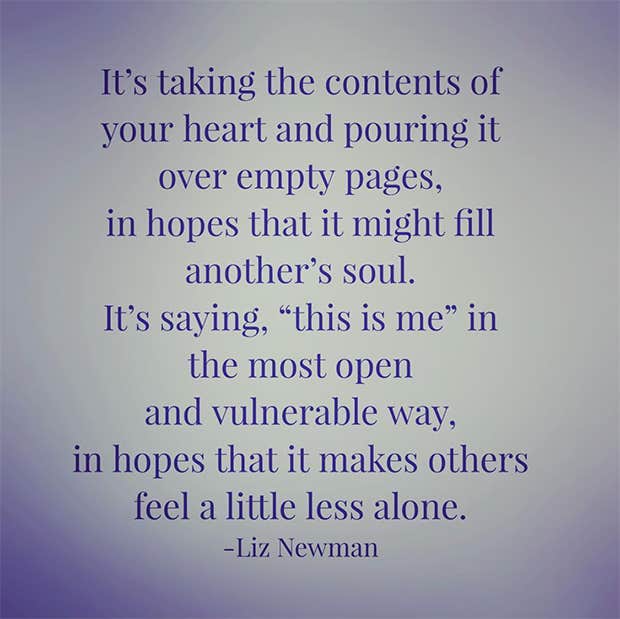 “It’s taking the contents of your heart and pouring it over empty pages, in hopes that it might fill another’s soul. It’s saying, ‘This is me,’ in the most open and vulnerable way, in hopes that it makes others feel a little less alone.” —Liz Newman