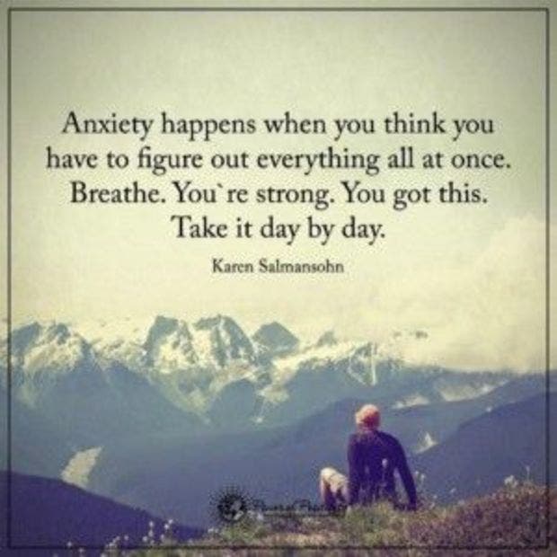 Anxiety happens when you think you have to figure out everything all at once. Breathe. You're strong. You got this. Take it day by day.