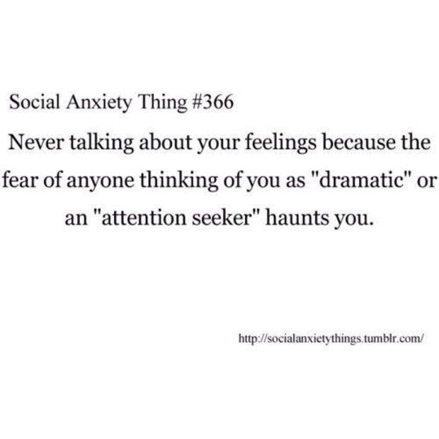 Social Anxiety Thing #366: Never talking about your feelings because the fear of anyone thinking of you as "dramatic" or an "attention seeker" haunts you