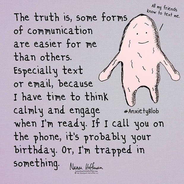 The truth is, some forms of communication are easier for me than others. Especially text or email, because I have time to think calmly and engage when I'm ready. If I call you on the phone, it's probably your birthday. Or, I'm trapped in something.