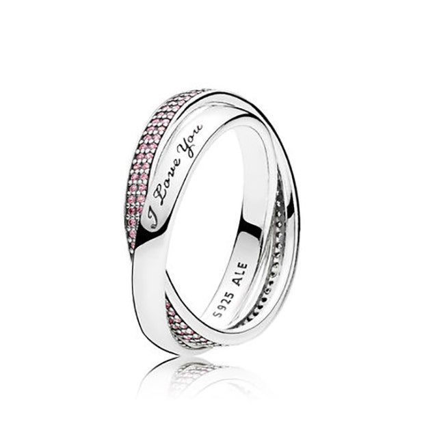 This ring is the perfect way to say I love you. It is literally carved into it! With intertwined bands and pink cubic zirconia this ring will make her oh so happy.