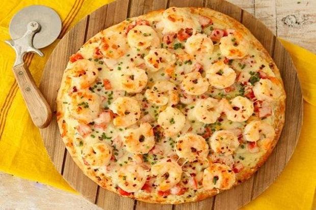 18. Garlic shrimp deep dish pizza with garlic oil.