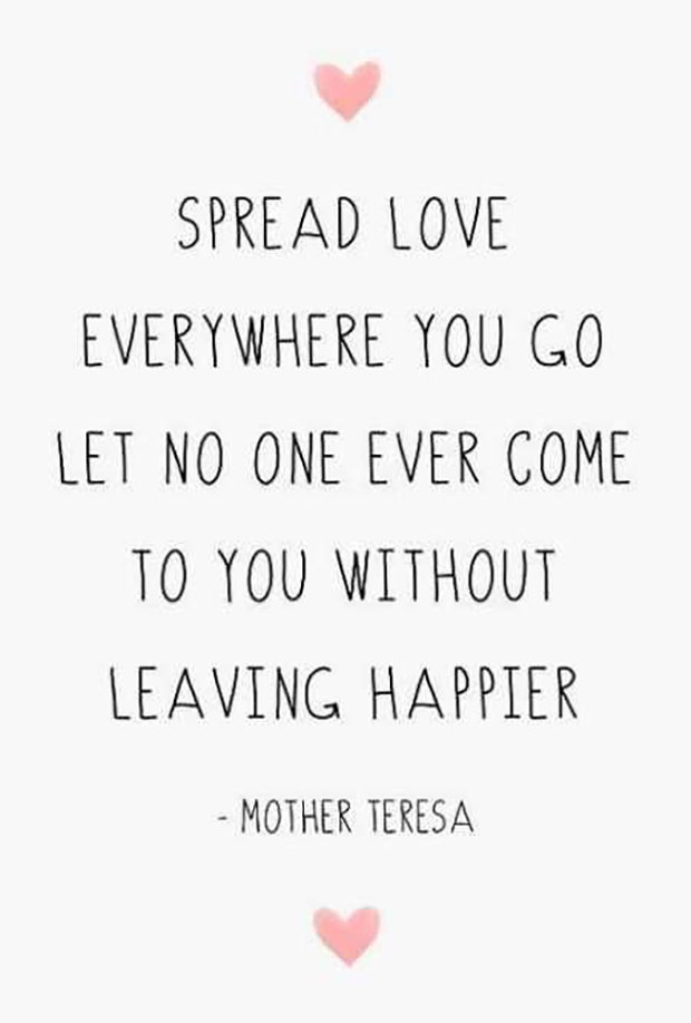 "Spread love everywhere you go let no one ever come to you without leaving happier."- Mother Teresa