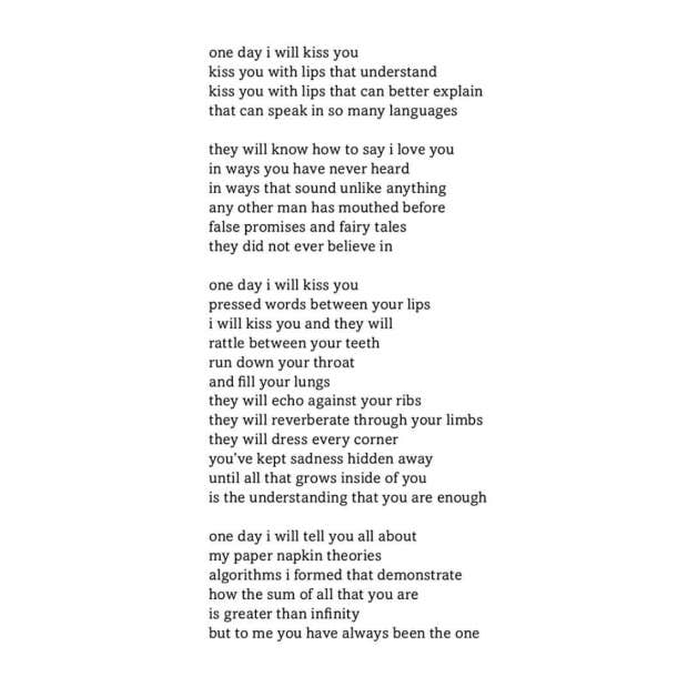 "One day I will kiss you, kiss you with lips that understand, kiss you with lips that can better explain, that can speak in so many languages. They will know how to say I love you in ways you have never heard, in ways that sound unlike anything any other man has mouthed before, false promises and fairy tales they did not ever believe in. One day I will kiss you, pressed words between your lips. I will kiss you and they will rattle between your teeth, run down your throat, and fill your lungs. They will echo against your ribs, they will reverberate through your limbs, they will dress every corner you’ve kept sadness hidden away until all that grows inside of you is the understanding that you are enough. One day I will tell you all about my paper napkin theories, algorithms I formed that demonstrate how the sum of all that you are, is greater than infinity, but to me you have always been the one.” – Tyler Kent White