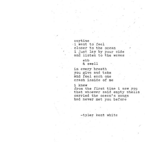"Anytime I want to feel closer to the ocean, I just lay by your side and listen to the waves ebb and swell in every breath you give and take, and feel each one crash inside of me. I knew from the first time I saw you that whoever said empty shells carried the ocean’s songs had never met you before.” – Tyler Kent White