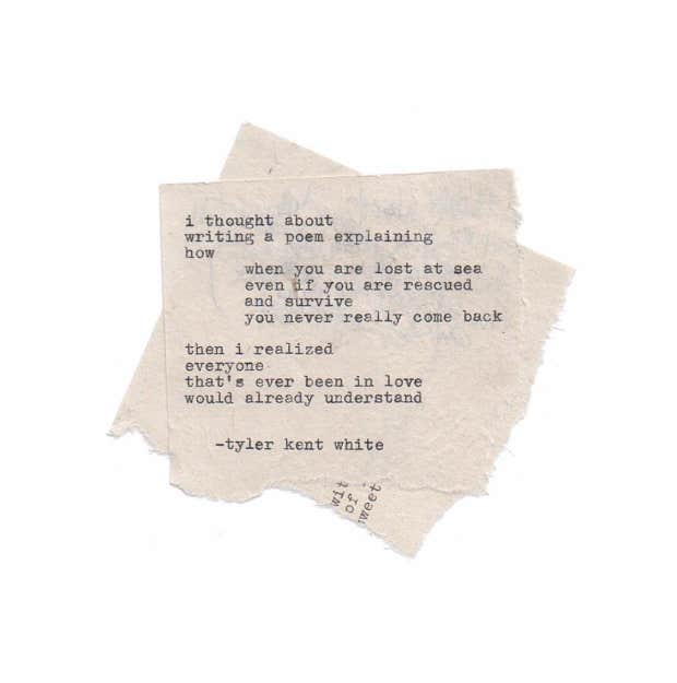 "I thought about writing a poem explaining how when you are lost at sea, even if you are rescued and survive, you never really come back. Then I realized everyone that’s ever been in love would already understand.” – Tyler Kent White