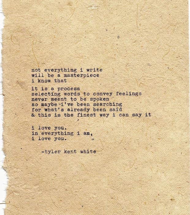 "Not everything I write will be a masterpiece; I know that. It is a process selecting words to convey feelings never meant to be spoken. So maybe I’ve been searching for what’s already been said and this is the finest way I can say it. I love you, in everything I am, I love you.” – Tyler Kent White