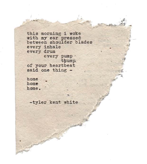 "This morning I woke with my ear pressed between shoulder blades. Every inhale, every drum, every pump, thump of your heartbeat said one thing – home, home, home.” – Tyler Kent White