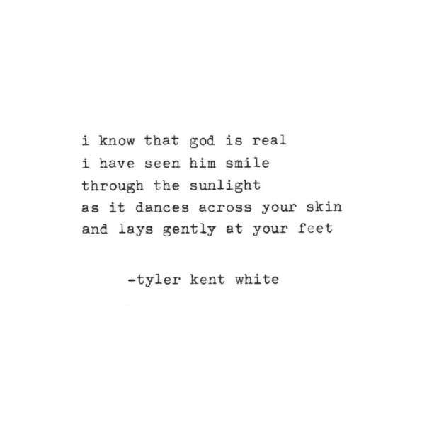 "I know that god is real. I have seen him smile through the sunlight as it dances across your skin and lays gently at your feet.” – Tyler Kent White