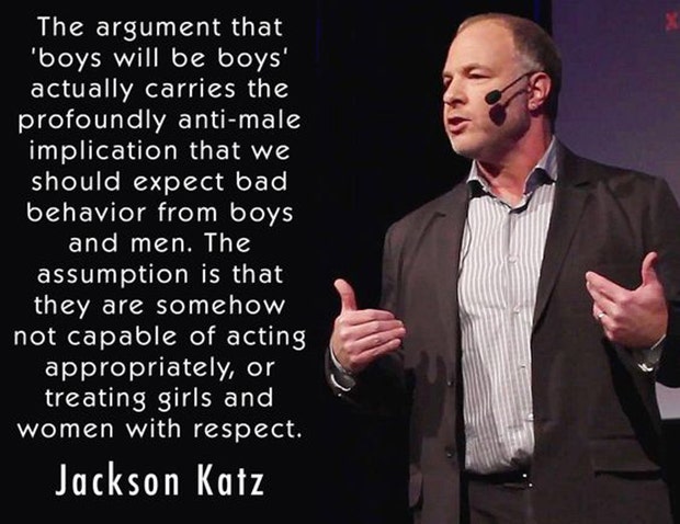 “The argument that ‘boys will be boys’ actually carries the profoundly anti-male implication that we should expect bad behaviors from boys and men. The assumption is that they are somehow not capable of acting appropriately, or treating girls and women with respect. ” -Jackson Katz