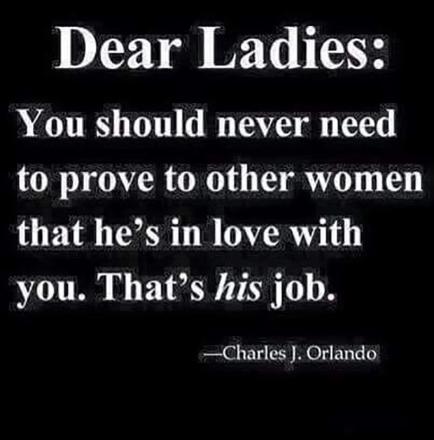 “Dear Ladies: You should never need to prove to other women that he’s in love with you. That’s his job.” - Charles J. Orlando