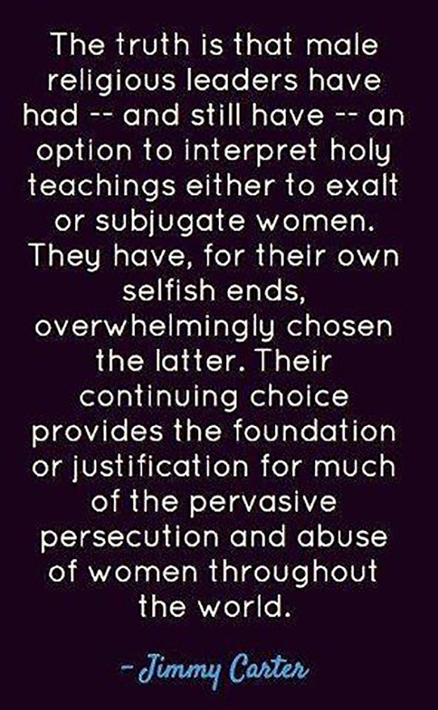 “The truth is that male religious leaders have had – and still have – an option to interpret holy teachings either to exalt or subjugate women. They have, for their own selfish ends, overwhelmingly chosen the later. Their continuing choice provides the foundation or justification for much of the pervasive persecution and abuse of women throughout the world.” -Jimmy Carter